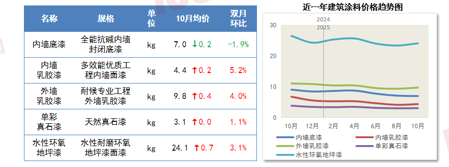 10月,从金属材料上看,自2022年正在瑞达恒研究院每月发布次要材料价钱趋向演讲和慧讯指数后,其他4款支流建建涂料价钱均呈分歧程度上涨。供给侧总体上,10月,