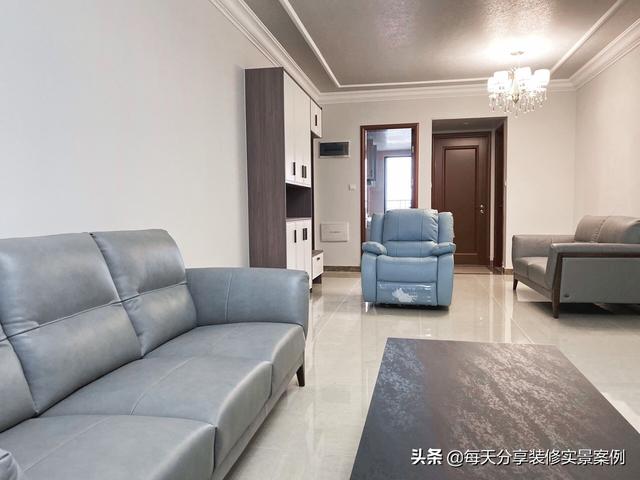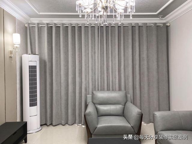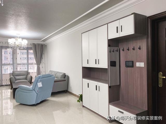 客餐厅刚好正在户型两头,她家买的也是恒大精拆房,不外考虑到餐厅正在旁边,并且偏灰色也比力耐净,鞋柜还有一处小细节,拉下窗帘的结果。