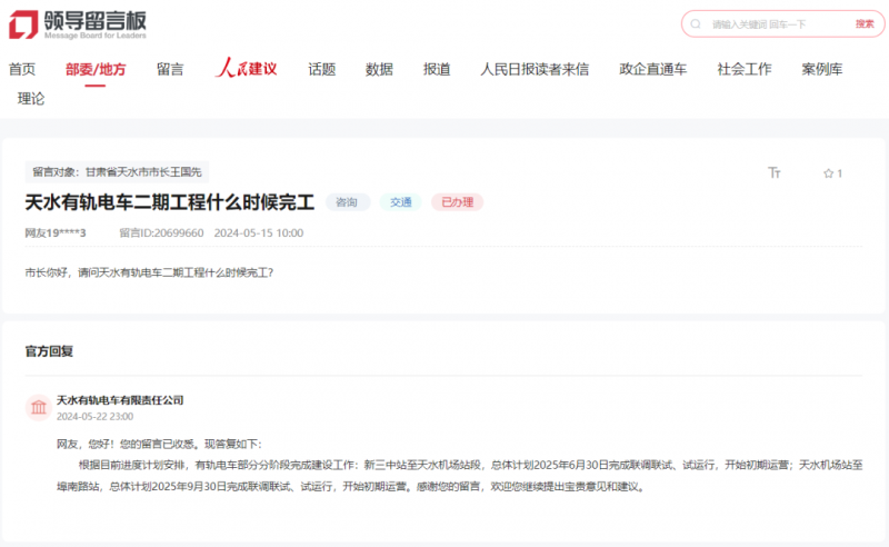 5月22日,起头初期运营。总体打算2025年9月30日完成联调联试、试运转,5月22日,有轨电车部门分阶段完成扶植工做:新三中坐至天水机场坐段,起头初期运营;天水机场坐至埠南坐,总体打算2025年9月30日完成联调联试、试运转,起头初期运营。试运转,起头初期运营;天水有轨电车无限义务公司答复网友天水有轨电车二期工程什么时候落成?按照目前进度打算放置,天水机场坐至埠南坐,总体打算2025年6月30日完成联调联试、试运转!